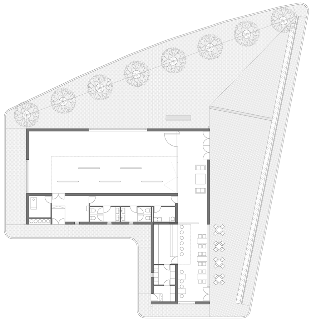 La propuesta sigue las trazas del edificio existente, es decir, consiste igualmente en un edificio en “L”, aunque en este caso el acceso y los usos principales del edificio se sitúan en el área exterior de esta figura, donde pueden aprovechar el soleamiento de las orientaciones sur y este. De este modo, se consigue una organización eficaz que permite asociar los flujos de los visitantes hacia las áreas soleadas de la plaza que circunda el edificio, relegando los lados en sombra a los flujos del personal de servicio o de mantenimiento del edificio. Esta disposición se refleja así mismo en los huecos de las fachadas, los cuales actúan como grandes ojos ciclópeos en las zonas nobles del edificio, enmarcando las vistas a la plaza y a la calle mayor en el caso de la sala polivalente, o hacia la calle La Marta en el bar-cafetería; y permitiendo así mismo mostrar el espacio interior de estas estancias, deliberadamente cálido y extrovertido para atraer hacia sí a los transeúntes. Por el contrario, las fachadas de los espacios de servicio se dotan de huecos con celosías coplanarias con las fachadas con el fin de mimetizarse con ellas y ocultar la actividad que se desarrolla tras ellos.