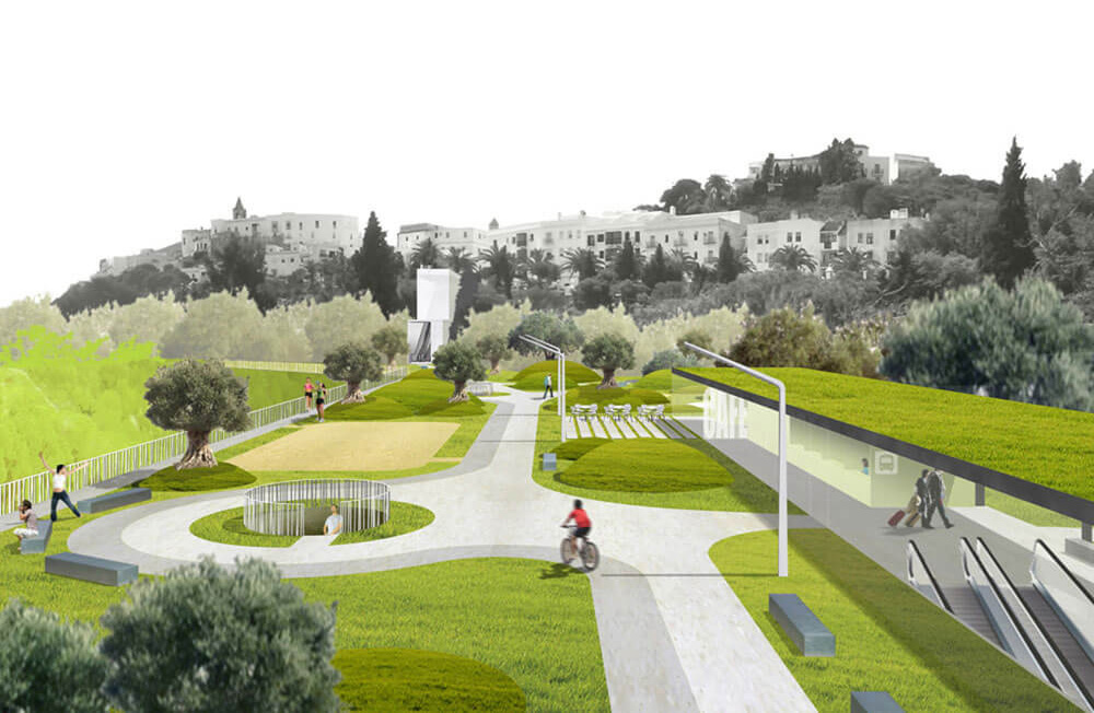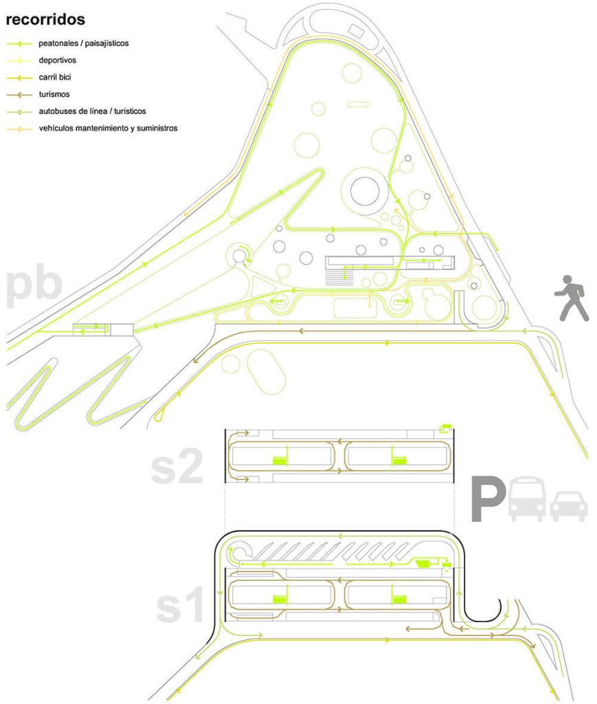 En definitiva, la actuación se resume en la creación de una alfombra verde que restaña un vacío en la espesura donde emergen dos piezas edificadas que responden respectivamente al entorno donde se ubican (intercambiador de transportes y pabellón de ingreso) que se configuran como dos grandes marcos orientados al paisaje desde los que mirar y ser vistos.