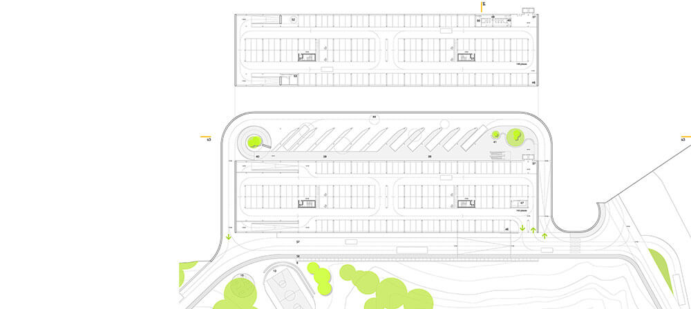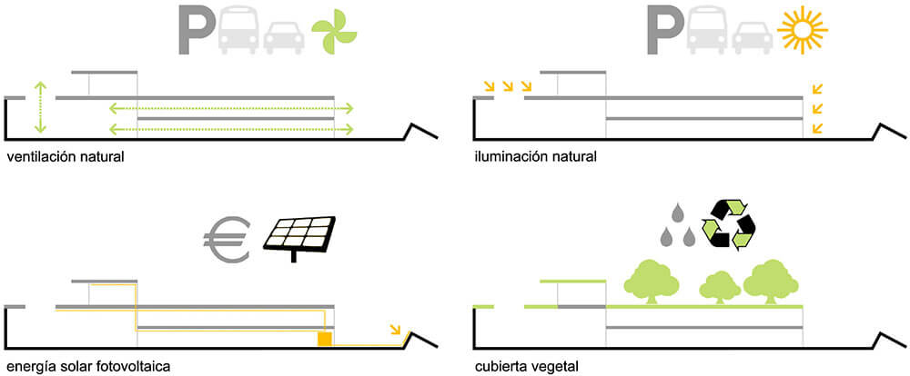 En primer lugar asociar en un único volumen bajo rasante el aparcamiento de vehículos y el intercambiador de transportes urbanos, situando dicho prisma en el límite norte de la zona de intervención, lugar donde actualmente se ubica la actual plataforma de aparcamiento de vehículos en superficie, que como es sabido se asienta sobre una capa de rellenos que se extiende hasta el citado límite. Esta decisión por una parte nos permite liberar la totalidad de la superficie sobre rasante para destinarla al parque equipado, y por otra, gracias a la topografía del terreno, dotar a dicho volumen bajo rasante de ventilación natural y vistas a un mínimo coste. De este modo el grueso de la masa edificada que demanda el programa queda oculto, aflorando únicamente sobre rasante el acceso principal del intercambiador de transportes y el pabellón de ingreso al centro histórico, que a su vez quedan mimetizadas con el propio parque y la ciudad respectivamente.