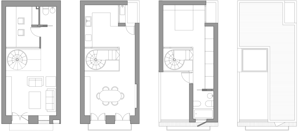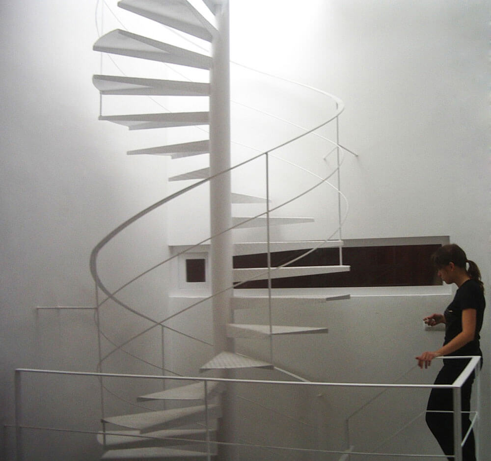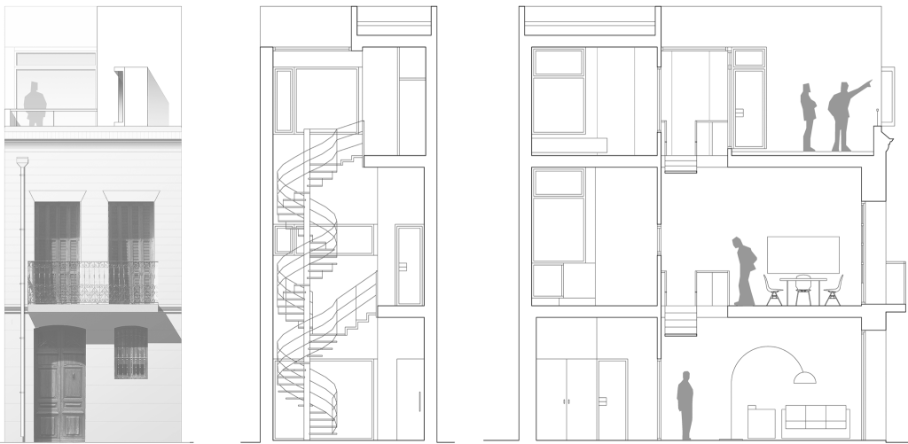 Los destinatarios, amantes de la arquitectura, tenían el deseo de explotar al máximo las posibles cualidades espaciales de tan reducido espacio, por lo que decidió hacer de la sección del edificio la protagonista de la intervención. Una escalera de caracol situada en el centro de la planta actúa como eje vertebrador de la vivienda. El espacio ocupado por ella, coronado por un lucernario que introduce luz cenital durante todo el día, funciona como un patio interior al que vierten las distintas estancias de la casa, proporcionando no solo luz natural sino a su vez relaciones visuales cruzadas y en consecuencia potenciando múltiples percepciones del espacio habitable y en definitiva convirtiendo en espacioso lo que antes no lo era, objetivo en definitiva de la intervención. La diferencia entre la fachada pre-existente y la ampliación, se significan en el contraste entre la limpieza del nuevo volumen y la fachada original que data de principio del siglo XX.