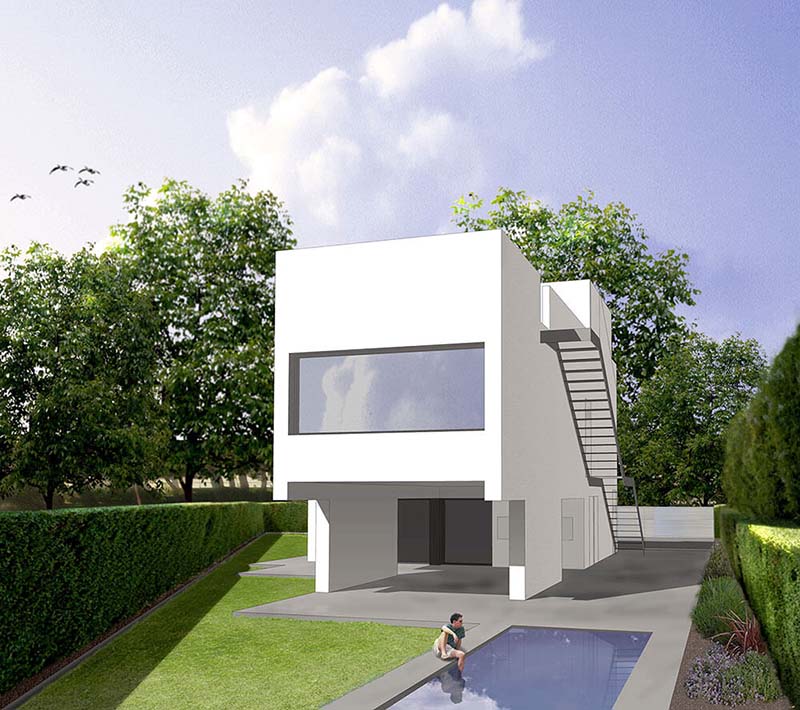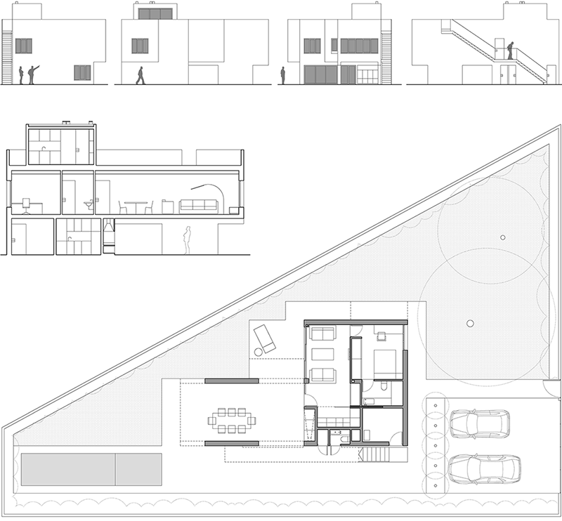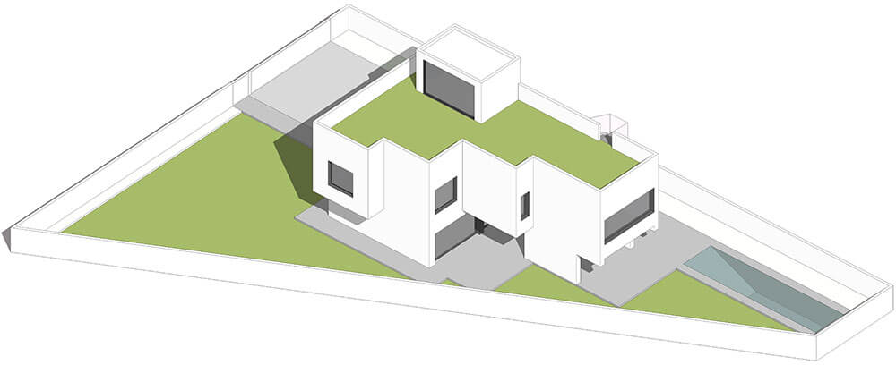 Toda la vivienda se cierra al norte y a las vistas del predio colindante, y se abre por contra al sur y al paisaje. En el flanco norte se ubica el eje de circulación principal, una escalera lineal exterior a la fachada que comunica todos los ámbitos que componen el recorrido de los habitantes normalmente; aparcamiento y acceso en planta baja, acceso a la vivienda principal en planta primera, acceso al mirador en planta de cubiertas. Y todo ello con independencia física y visual de los posibles huéspedes que se alojen el pabellón de invitados.