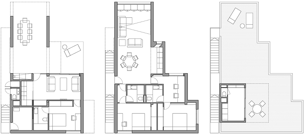 Nuestra intervención propone una nueva distribución de los espacios, de tal modo que la vivienda principal se sitúe en planta primera, el pabellón de invitados en planta baja y finalmente, en cubierta, se ubique un espacio de relación y disfrute común.