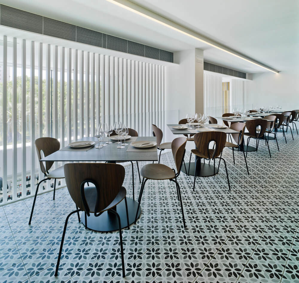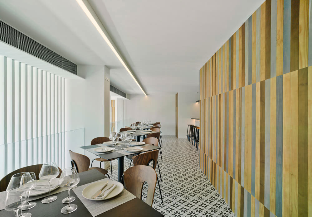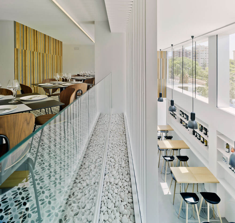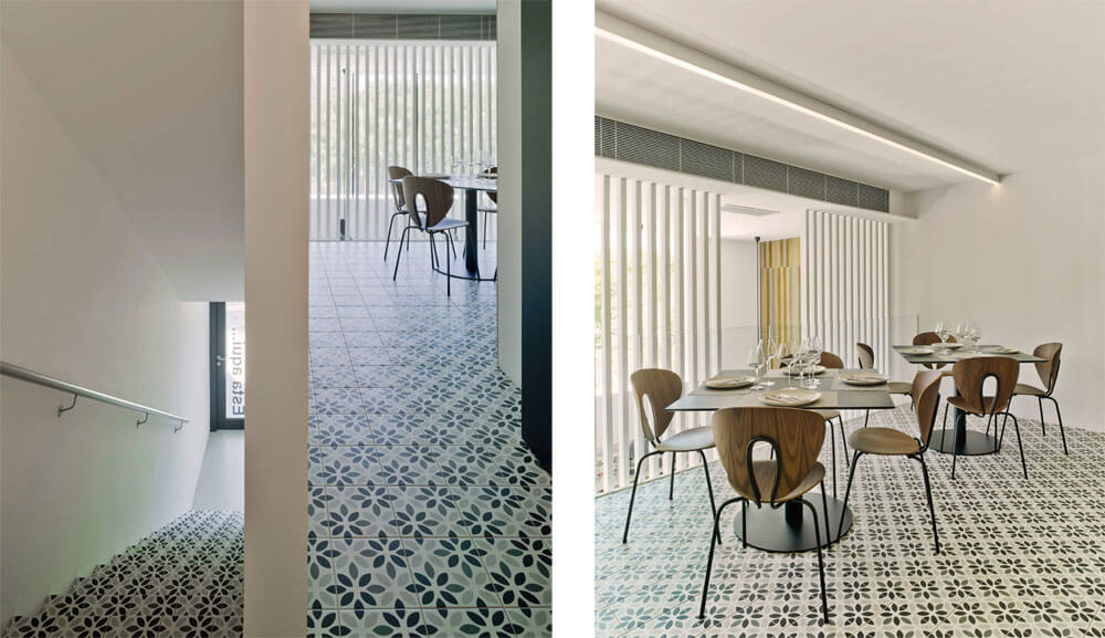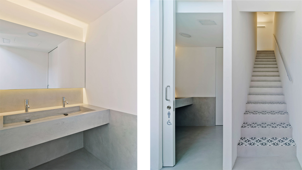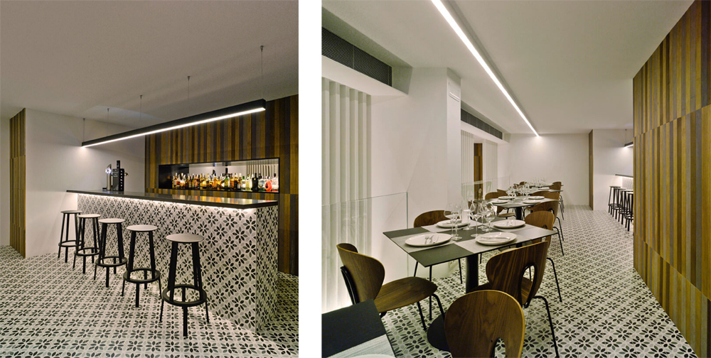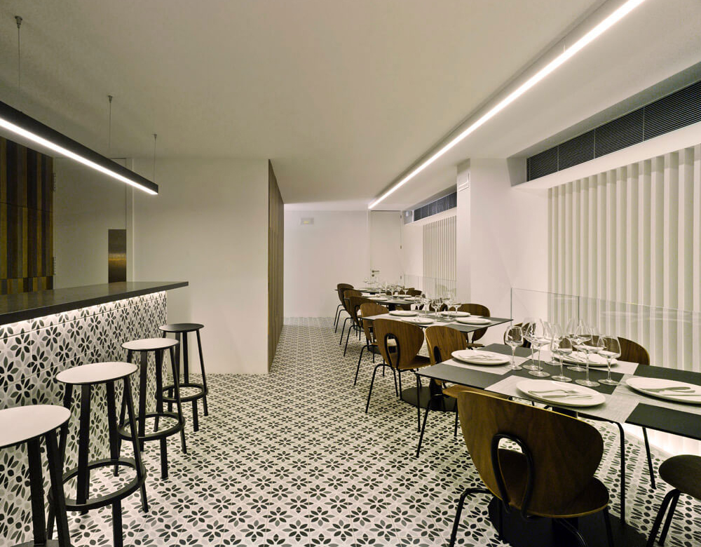 En el interior, los pavimentos de ambas plantas son planos de la misma naturaleza, neutros, grises, pesados. En planta baja, se utiliza un micromortero de resinas, más sufrido, que se entrelaza en la escalera con el pavimento de planta primera, un plano cerámico que emula a la baldosa hidráulica tradicional, y que pretende aportar tradición, detalle y laboriosidad, en alusión a la calidad de la oferta gastronómica que le depara al cliente.