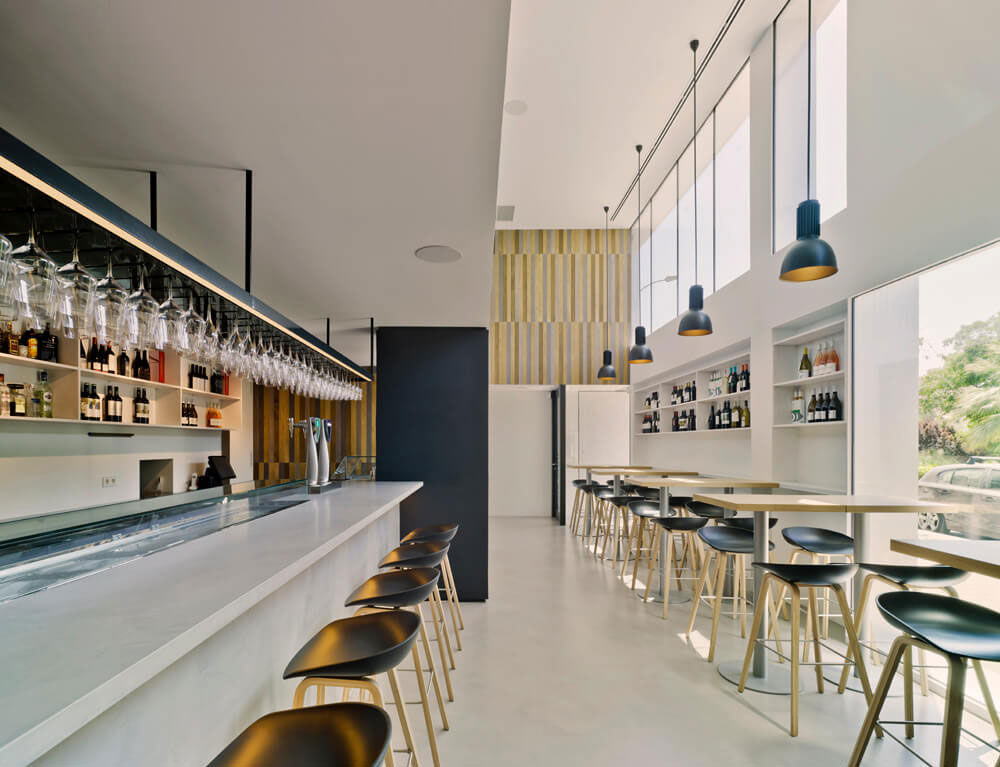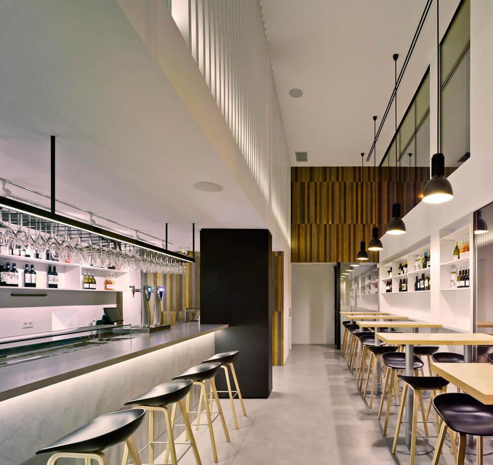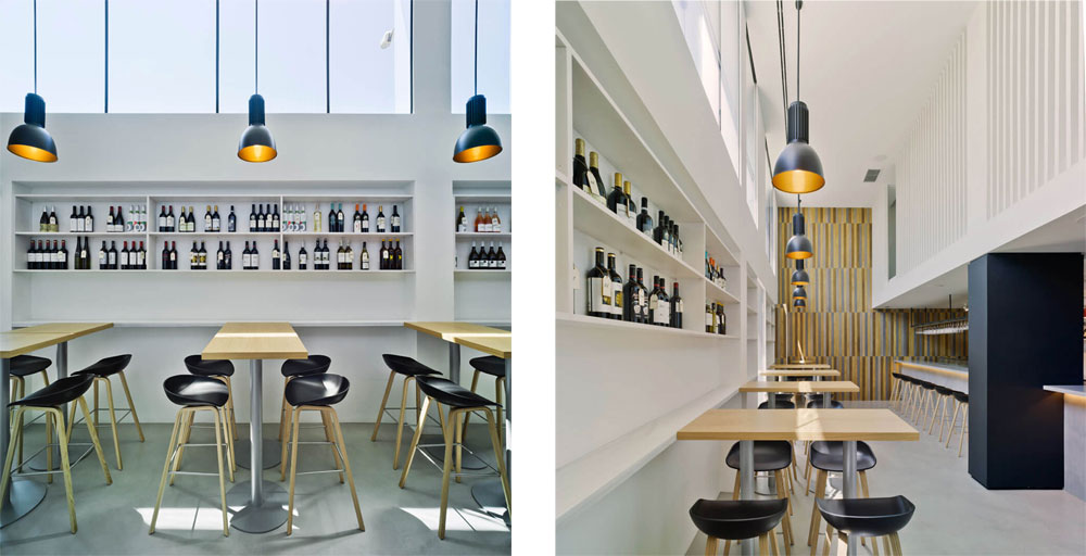 En segundo lugar, y como no podía ser de otra manera, se ha procurado que el espacio a doble altura se reconozca como el corazón del establecimiento, concentrando la atención del espectador en su altura, para lo cual se han cuidado con esmero los planos que lo delimitan, la luz que lo tensa y las relaciones visuales que permiten su contemplación desde distintos ámbitos del establecimiento.