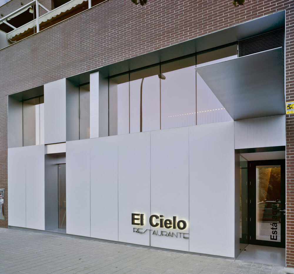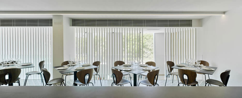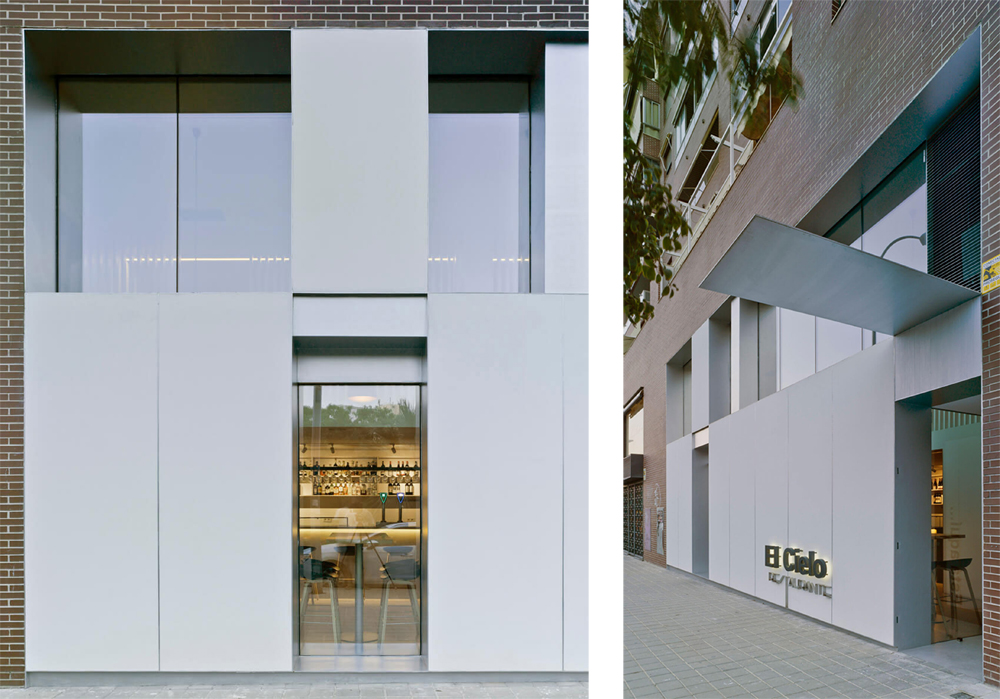 Entre las decisiones de proyecto cobran especial interés tres ellas. En primer lugar, el tratamiento del cerramiento de fachada, concebido como un plano preciso, ordenado en módulos de clara componente vertical, y con un grosor deliberadamente exagerado. Este plano, a nivel de planta baja es prácticamente ciego, y tiene como misión marcar un límite claramente definido entre una vía urbana desangelada y un interior cálido y acogedor, entre dentro y fuera. Así mismo, la fachada en este nivel, actúa como protección contra el soleamiento y como elemento necesario para preservar la intimidad de los usuarios. A nivel de planta primera, la fachada se conforma como un gran hueco que enmarca las copas de los árboles del bulevar cercano, ofreciendo una vista amable del exterior a los comensales. Esta disposición presenta una anomalía, la cual consiste en el ‘desplazamiento’ vertical de uno de los módulos en los que está organizada la fachada, lo que posibilita crear una ‘ventana’ a nivel de la calle, y ofrecer al transeúnte la posibilidad de observar el interior que este grueso muro encierra.