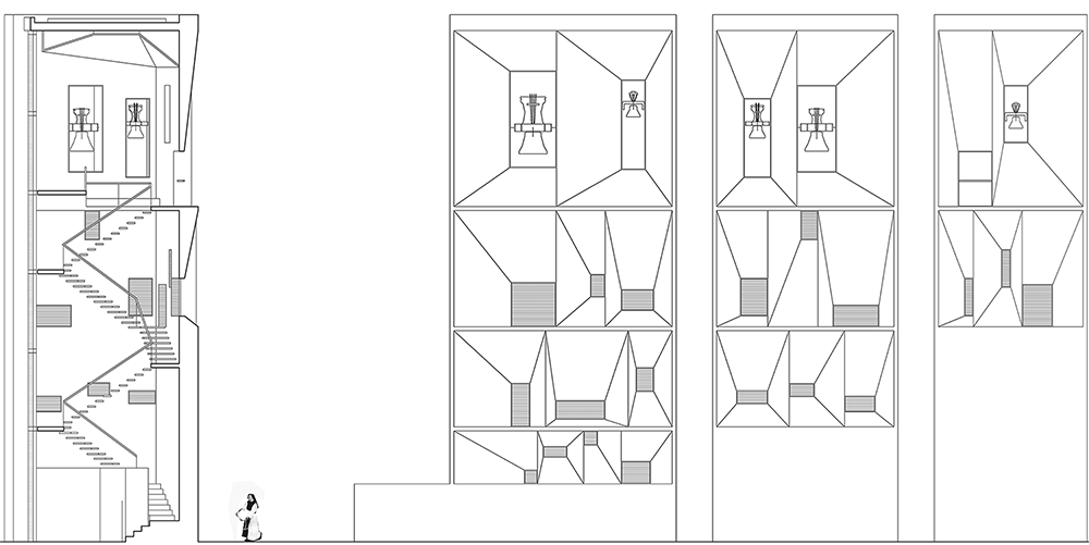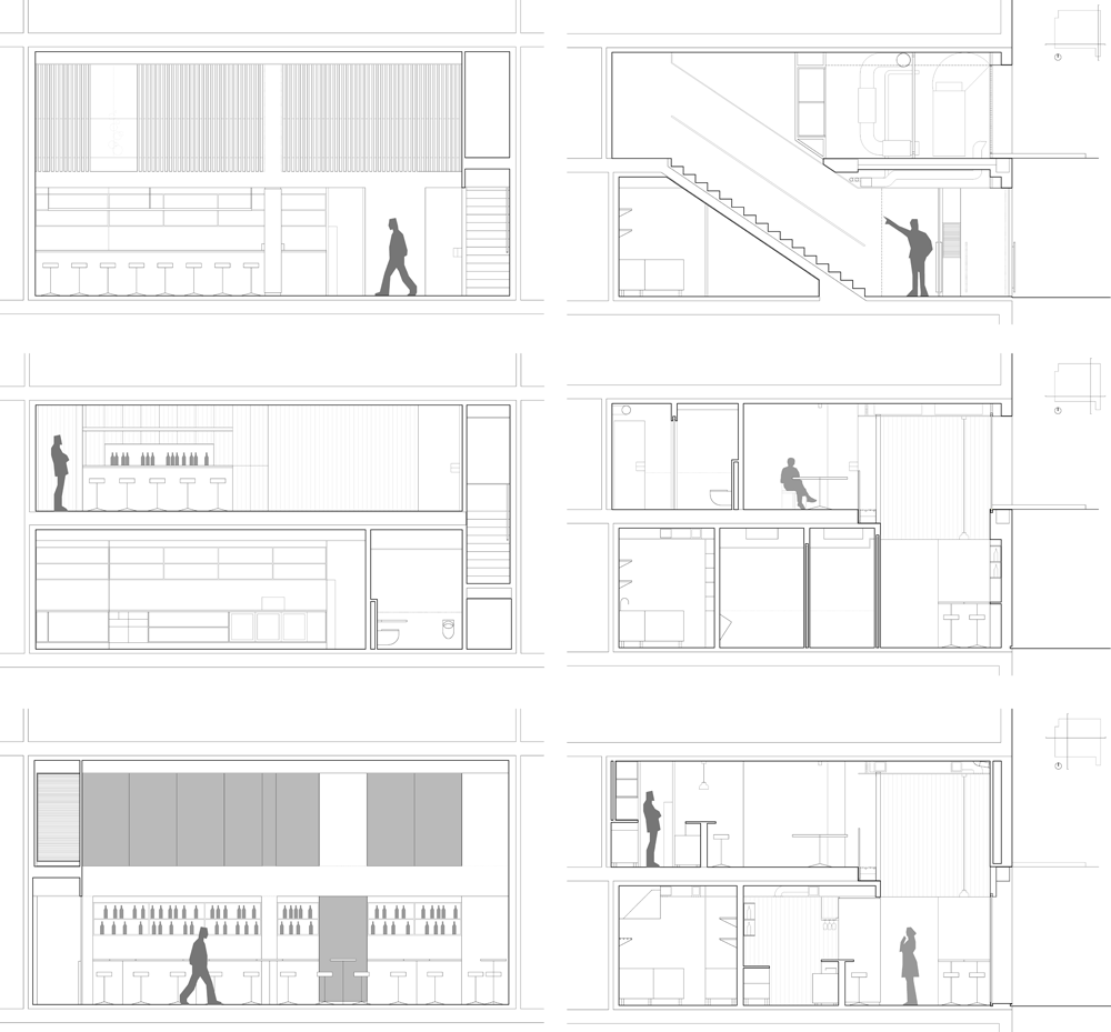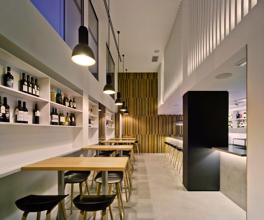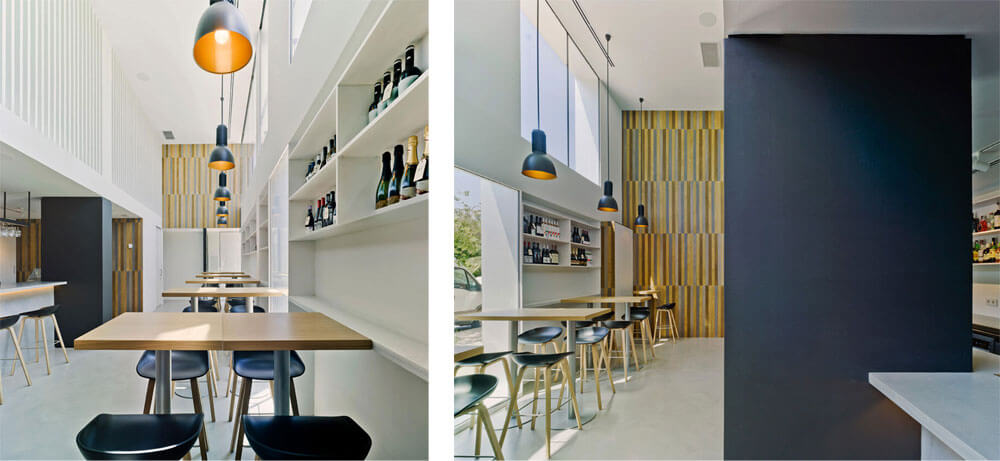 Los planos verticales y los techos, blancos, ligeros y luminosos, salvo los testeros de ambas plantas que son revestidos por un enlistonado de madera que otorga calidez y refuerza la lectura vertical del espacio, a la que también contribuyen otros órdenes de la intervención como la iluminación y el mobiliario.