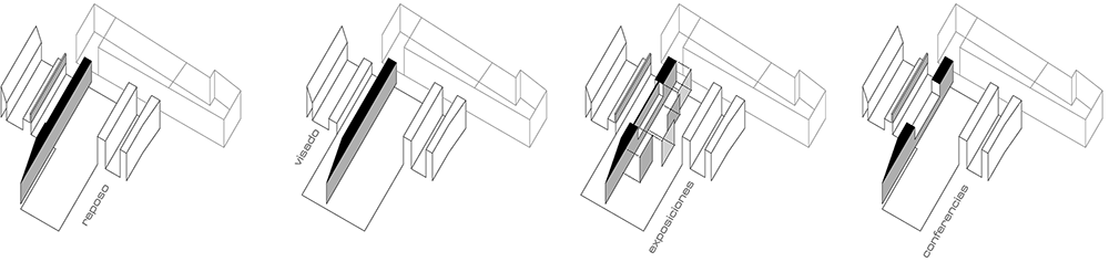 Por otro lado, se ha intentado que la pieza central condense la capacidad de provocar diversas situaciones, gracias a un sencillo pero eficaz movimiento de pantallas, que logra según los casos, cegar e independizar el área de gestión, la multiplicación del espacio expositivo y la alteración de la organización espacial, todo ello sin desvirtuar la clara organización espacial que preside el proyecto.