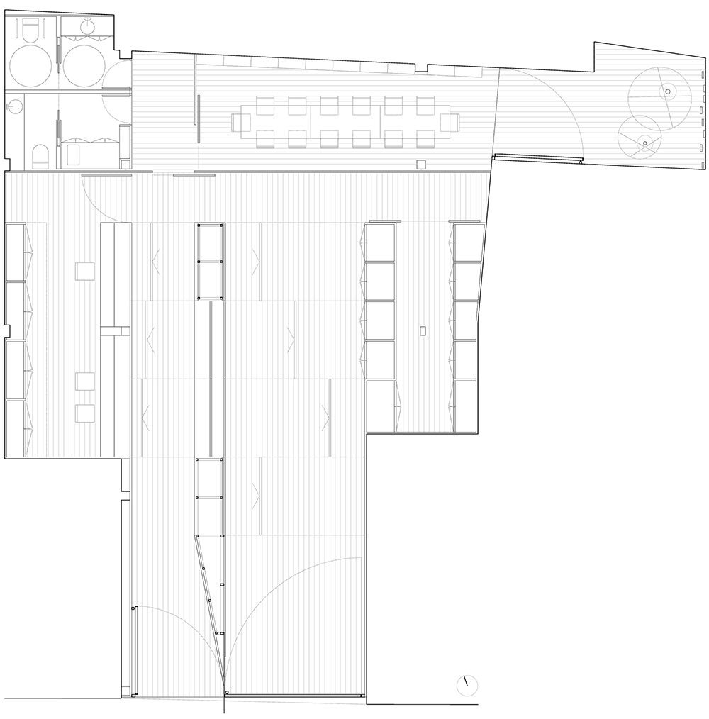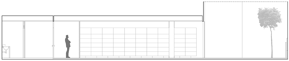 La estrategia es muy sencilla, una planta compartimentada por barras, donde los dos espacios principales, tramitación+ visado y la sala polivalente, quedan en franca relación con la vía pública y flanqueados por los espacios auxiliares, que les sirven y que regularizan el trazado arbitrario y residual de la planta; Como colofón a esta batería de espacios sin solución de continuidad aparente, se encuentra un plano terso y parlante de vidrio, que funciona como linterna, recogiendo la luz que capta del patio existente, que oculta los servicios, y nos muestra la biblioteca+sala de reuniones, la cual preside al mismo tiempo todos los espacios.