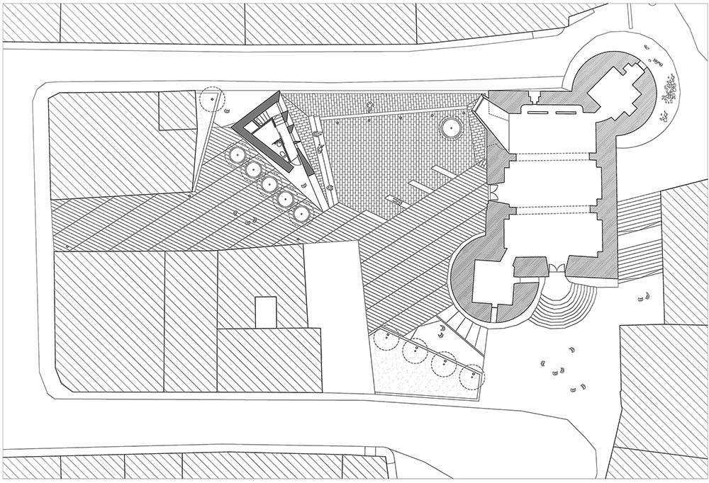 Finalmente, la ordenación del espacio público se concreta en un plano del suelo concebido con la misma lógica que la torre-campanario, un elemento animado que canaliza y subraya los flujos peatonales, al tiempo que se fusiona con los paramentos verticales que suponen el antepecho hacia la calle San José, para acotar una zona de carácter estancial entre ambas edificaciones.