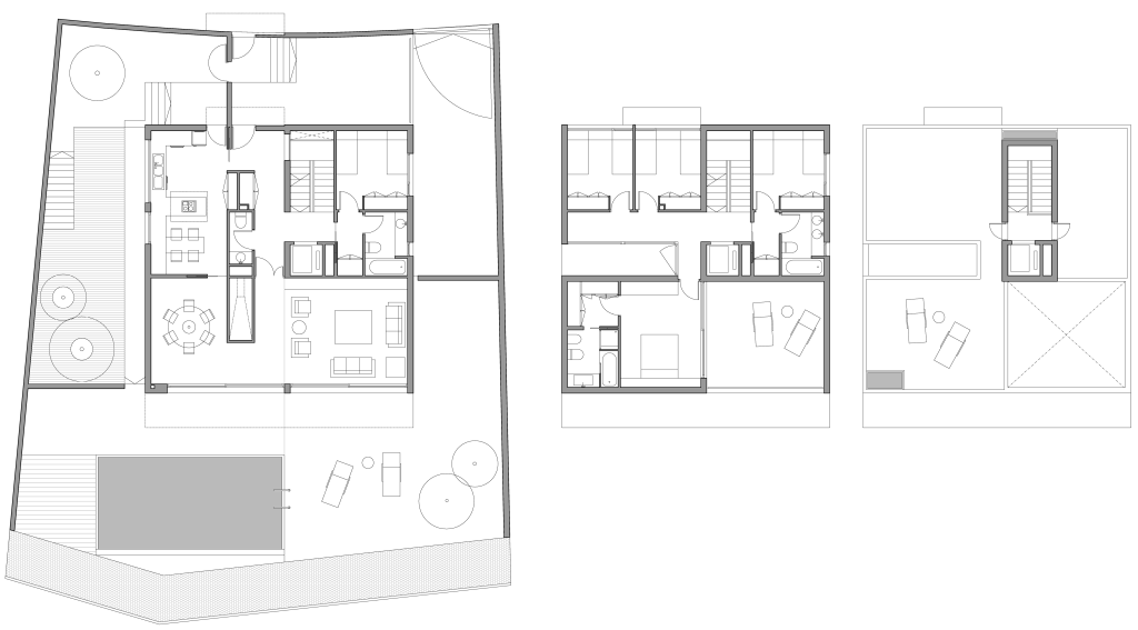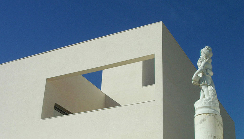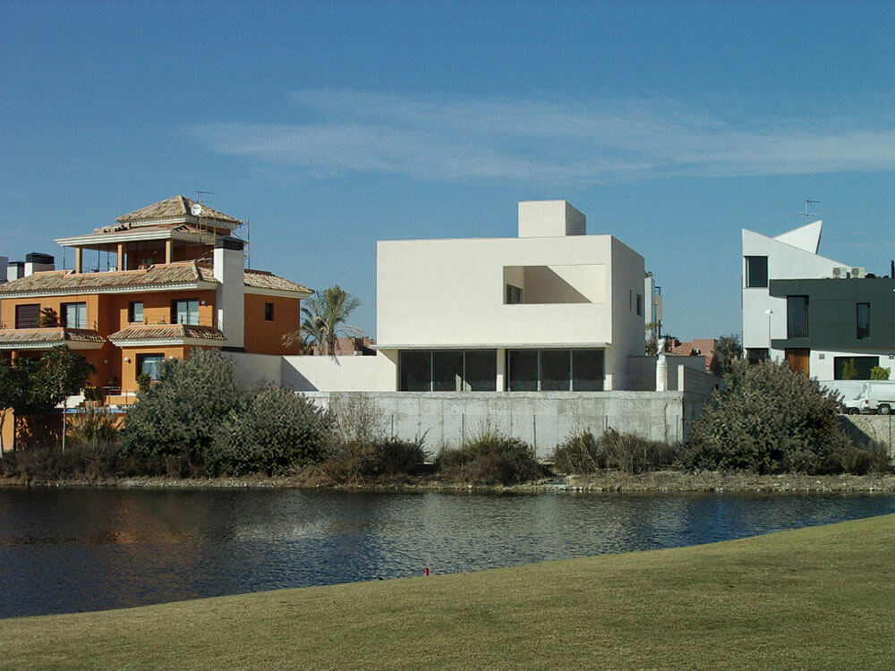 En este sentido se proyectó una vivienda hermética y masiva, un cubo blanco de 11,65 m de arista que muestra dos de sus tres plantas sobre rasante, y en el que se abren los huecos oportunos para iluminar los espacios interiores limitando las vistas del vecindario, y al tiempo, fomentar la sensación de que el campo de Golf se perciba como una extensión de la misma. El espacio exterior asociado a la vivienda se sectoriza en distintos ámbitos espaciales para dar respuesta al programa de necesidades, incorporando al cerramiento de parcela como un elementos más de proyecto en la definición de dichos espacios.